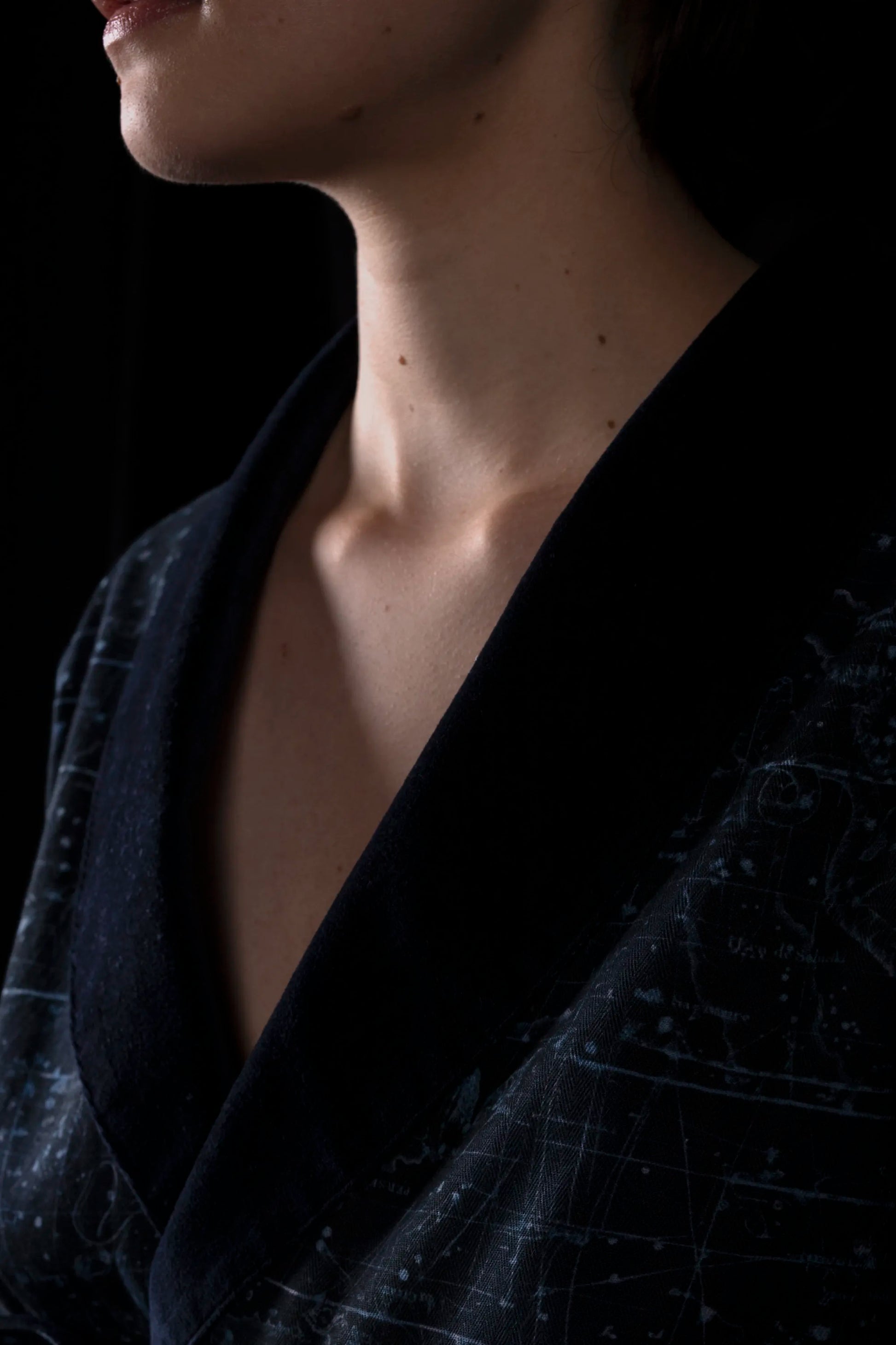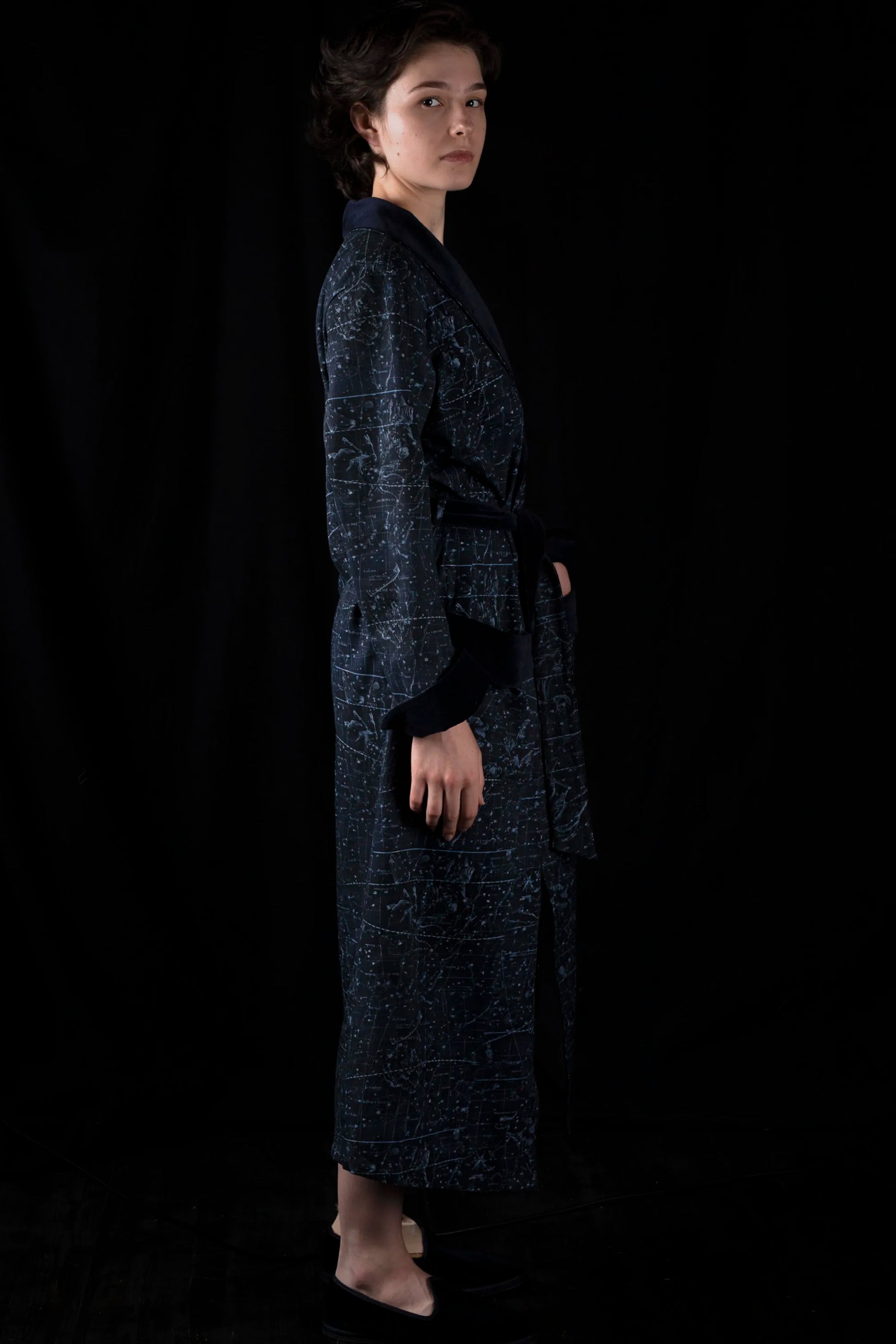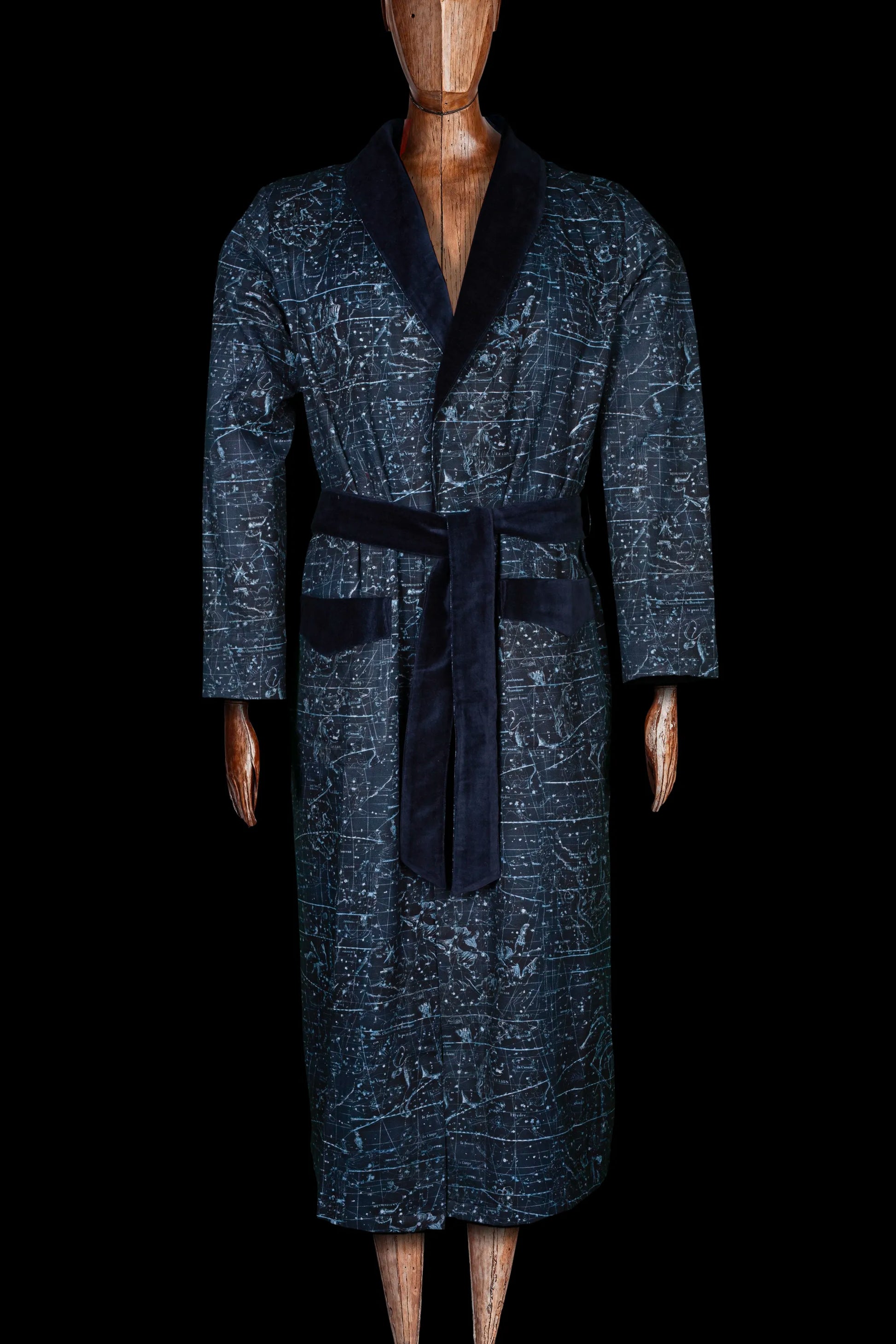 DRESSING-GOWN NAVY-Blue 100% COTTON Herringbone-Thick-Brushed-inside-Velvet Constellations digital-print