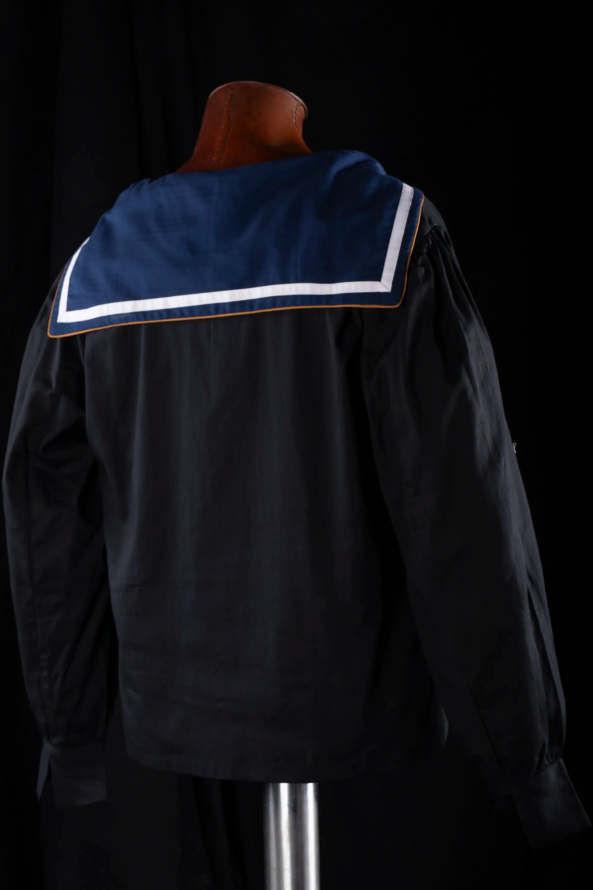 Hip-length shirt with square sailor collar, V-neck, and piped trim. Cut like a typical shirt, it offers mobility while preserving the maritime collar’s protective function. Today it works as a casual summer shirt or beach layer. On transatlantic crossings, short sailor shirts of this type gave freedom of movement on deck, shielding the neck from backdrafts without restricting the arms in cramped or windy conditions.
